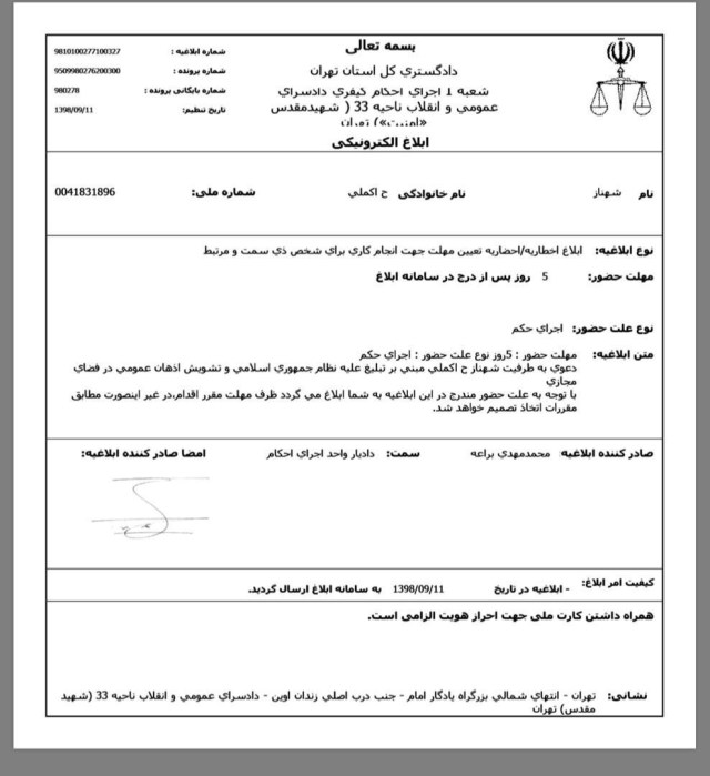 به گزارش کمپین دفاع از زندانیان سیاسی و مدنی، در احضاریهای که به دست خانم اکملی رسیدهاست، وی باید ظرف مهلت ۵ روزه در شعبه ۱ اجرای احکام کیفری دادسرای انقلاب حاضر شود.