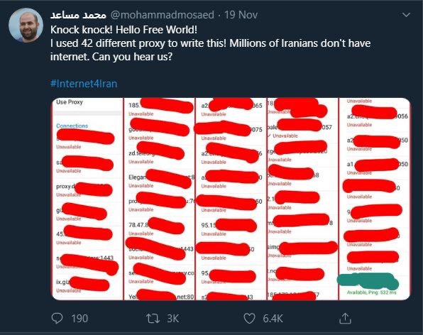 این روزنامهنگار در یکی از پستهایش در توییتر نوشتهبود: «سلام بر جهان آزاد! من برای نوشتن این مطلب از ۴۲ پراکسی مختلف استفاده کردم! میلیون ها ایرانی اینترنت ندارند. می توانید ما را بشنوید؟»