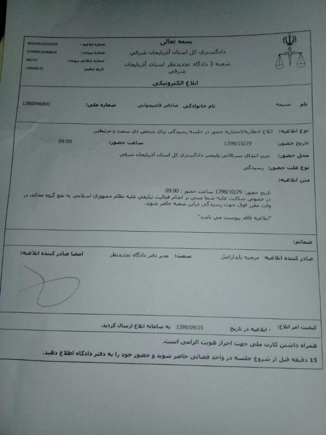 به گزارش کمپین دفاع از زندانیان سیاسی و مدنی، بر اساس ابلاغیهای که روز سهشنبه ۲۶ آذر ماه ۱۳۹۸، از طریق سامانه الکترونیکی قوه قضاییه (ثنا) برای نسیم صادقی، فعال ترک (آذربایجانی) ارسال شدهاست، از او خواسته شده که ساعت ۹ صبح روز یکشنبه ۲۹ دیماه در شعبه سوم دادگاه تجدیدنظر استان آذربایجان شرقی حاضر شود.