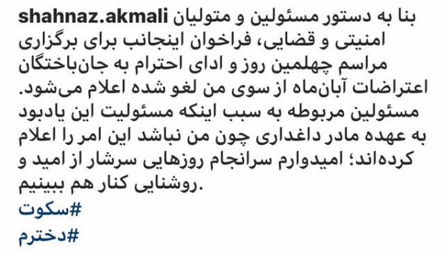 شهناز اکملی نیز پس از این موضوع خبر داد که فراخوان خود برای برگزاری مراسم چهلمین روز و ادای احترام به جانباختگان را پس گرفتهاست و آنرا لغو شده اعلام کرد که به نظر میرسد این موضوع با فشار نهادهای امنیتی صورت گرفتهاست.