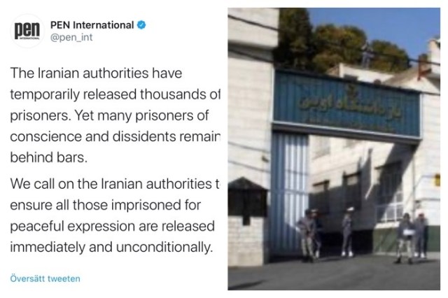 به گزارش کمپین دفاع از زندانیان سیاسی و مدنی، روز دوشنبه ۸ اردیبهشت ماه ۱۳۹۹، انجمن جهانی قلم با انتشار متنی در توئیتر اعلام کرد:«مقامات ایران موقتاً هزاران زندانی را آزاد کردهاند. اما با این وجود بسیاری از زندانیان عقیدتی و دگراندیشان پشت میلههای زندان باقی ماندهاند.»