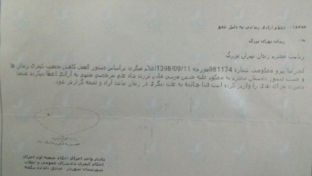 امروز یکشنبه ۱۴ اردیبهشت ماه ۱۳۹۹, حسین موسی خانی زندانی سیاسی که از تاریخ ۱۶ اسفند ماه سال گذشته در پی شیوع ویروس کرونا به مرخصی اعزام شده بود پس از مراجعه به شعبه ۱ اجزای احکام دادسرای عمومی و انقلاب شهرستان شهریار نامه آزادی مشروط خود را دریافت کرد.