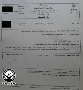 براساس این ابلاغیه اکرم رحیم پور جهت “دفاع از اتهام انتسابی” به شعبه ۲ دادسرای عمومی و انقلاب تهران به ریاست محمود حاج مرادی فراخوانده شده است.