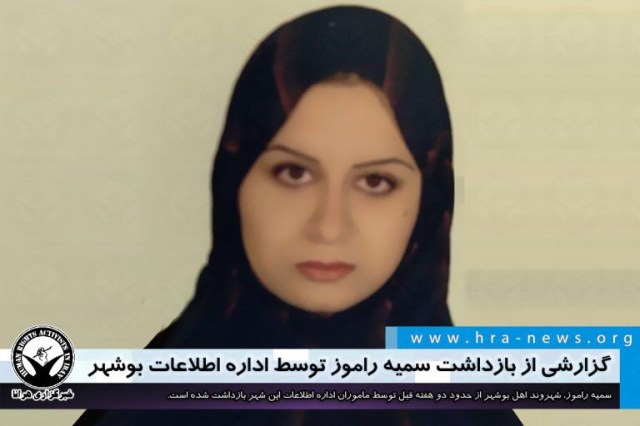 ارگان خبری مجموعه فعالان حقوق بشر در ایران، سمیه راموز، شهروند اهل بوشهر از حدود دو هفته قبل توسط ماموران اداره اطلاعات بازداشت شده است.