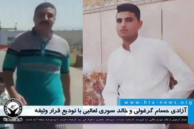 حسام گرغولى و خالد سوری ثعالبی، دو شهروند بازداشت شده در شهرهای ماهشهر و اهواز طی روز گذشته و امروز با تودیع قرار وثیقه تا پایان مراحل دادرسی آزاد شدند. حسام گرغولى پیشتر در اویل ماه جاری و آقای ثعالبی در فروردین سال گذشته توسط ماموران امنیتی بازداشت شدند.
