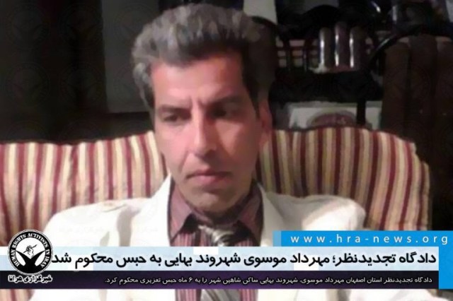 دادگاه تجدیدنظر استان اصفهان مهرداد موسوی، شهروند بهایی ساکن شاهین شهر را به ۶ ماه حبس تعزیری محکوم کرد. آقای موسوی پیشتر در مرحله بدوی توسط شعبه ۱۰۳ دادگاه شاهین شهر به ۶ ماه حبس تعزیری محکوم شد.