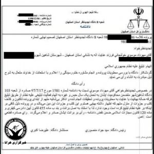 براساس این حکم که توسط شعبه ۸ دادگاه تجدیدنظر استان اصفهان به ریاست قاضی سیدجواد منصوری و مستشاری محمد محمدی کمال آبادی در تاریخ ۲۱ خردادماه ۹۹ صادر و ابلاغ شده است. آقای موسوی از بابت اتهام “فعالیت تبلیغی علیه نظام” به ۶ ماه حبس تعزیری محکوم شده است.