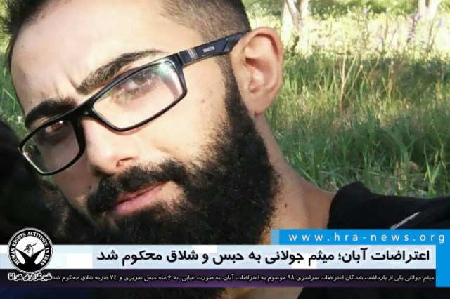 به گزارش خبرگزاری هرانا، ارگان خبری مجموعه فعالان حقوق بشر در ایران، میثم جولانی، فعال ترک (آذربایجانی) و یکی از بازداشت شدگان اعتراضات سراسری ۹۸ موسوم به “اعتراضات آبان”، به صورت غیابی توسط دادگاه کیفری ۲ اردبیل به ۶ ماه حبس تعزیری و ۷۴ ضربه شلاق محکوم شد.