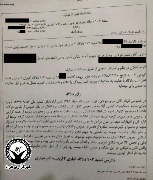 براساس این حکم که در تاریخ ۱۰ بهمن ماه ۹۸ تنظیم شده است، آقای جولانی توسط شعبه ۱۰۲ دادگاه کیفری ۲ اردبیل به ریاست قاضی اکبر حیدری از بابت اتهام “اخلال در نظم عمومی از طریق حرکات نامتعارف” به ۶ ماه حبس تعزیری و ۷۴ ضربه شلاق محکوم شده است.