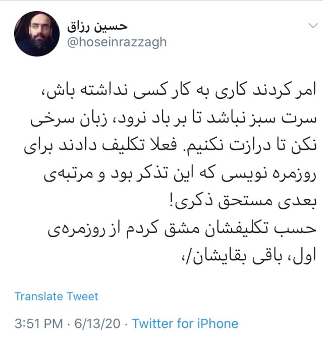 حسین رزاق، فعال سیاسی نیز شنبه گذشته در توییتر فشار امنیتی علیه خود را افشا کرد و نوشت: «امر کردند کاری به کار کسی نداشته باش، سرت سبز نباشد تا بر باد نرود، زبان سرخی نکن تا درازت نکنیم.»