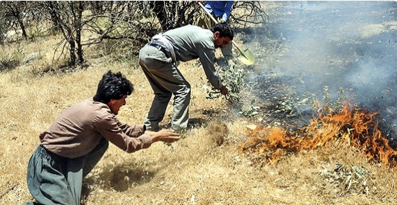 نیروهای داوطلب، روستاییان و تعدادی از نیروهای جمعیت هلال احمر که به خاموش کردن آتش کمک میکنند، به جز همین تعداد اندک دمنده، هیچ وسیله دیگری جز شاخههای بادام کوهی ندارند.