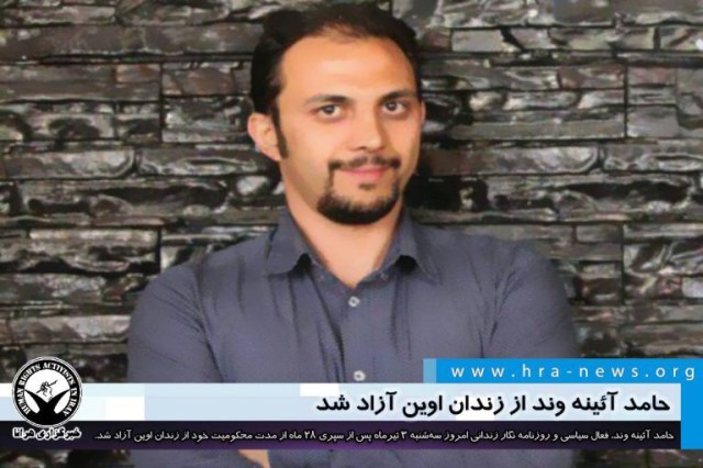 حامد آئینه وند، فعال سیاسی و روزنامه نگار زندانی امروز سهشنبه ۳ تیرماه پس از سپری کردن ۲۸ ماه از مدت محکومیت خود از زندان اوین آزاد شد. آقای آئینه وند پیشتر توسط دادگاه انقلاب تهران به ۶ سال حبس تعزیری محکوم شد. از این میزان با اعمال ماده ۱۳۴ قانون مجازات اسلامی، مجازات اشد یعنی ۵ سال حبس قابل اجرا بود.