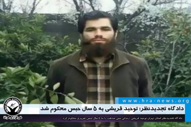 ارگان خبری مجموعه فعالان حقوق بشر در ایران، دادگاه تجدیدنظر استان تهران توحید قریشی، زندانی سنی مذهب را به ۵ سال حبس تعزیری محکوم کرد.