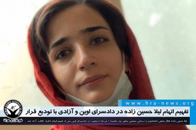 ارگان خبری مجموعه فعالان حقوق بشر در ایران، روز یکشنبه ۱ تیرماه ۱۳۹۹، لیلا حسین زاده، فعال صنفی دانشجوی و زندانی سیاسی سابق با حضور در دادسرای اوین پس از تفهیم اتهام با قرار کفالت آزاد شد.