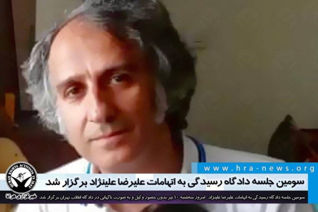 سومین جلسه دادگاه رسیدگی به اتهامات علیرضا علینژاد، برادر مسیح علینژاد، روزنامه نگار ایرانی ساکن آمریکا امروز سهشنبه ۱۰ تیرماه بدون حضور وکیل و به صورت ناگهانی در شعبه ۲۸ دادگاه انقلاب تهران برگزار شد. این جلسه قرار بود در تاریخ ۲۴ تیرماه برگزار شود. آقای علینژاد در تاریخ ۳ مهرماه ۹۸ توسط نیروهای امنیتی در منزل شخصی خود بازداشت شد و اردیبهشت امسال به بند عمومی زندان اوین منتقل شد.