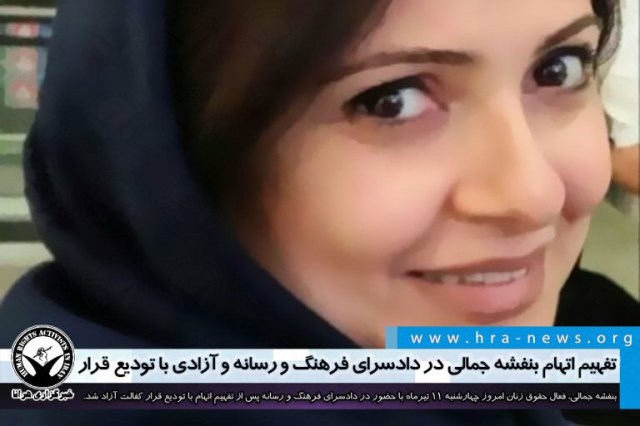 بنفشه جمالی، فعال حقوق زنان پیرو احضار قبلی صبح امروز چهارشنبه ۱۱ تیرماه با حضور در دادسرای فرهنگ و رسانه پس از تفهیم اتهام با تودیع قرار کفالت آزاد شد.