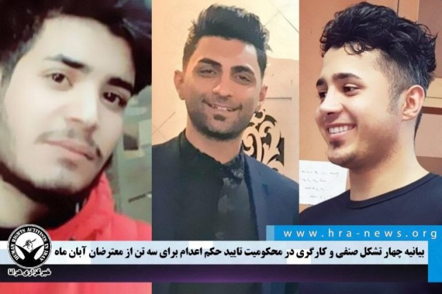به نقل از سندیکا کارگران نیشکر هفتتپه، امروز پنجشنبه ۱۲ تیرماه، سندیکای کارگران نیشکر هفت تپه، کانون صنفی معلمان اسلام شهر، انجمن صنفی معلمان کردستان –مریوان و سندیکای کارگران شرکت واحد اتوبوسرانی تهران و حومه در بیانیهای مشترک تایید حکم اعدام برای سه تن از بازداشتشدگان اعتراضات آبان ماه را محکوم کردند.