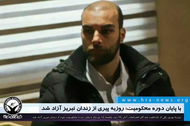 ارگان خبری مجموعه فعالان حقوق بشر در ایران، روز یکشنبه ۱۵ تیرماه ۱۳۹۹ روزبه پیری، یکی از بازداشت شدگان اعتراضات آبان ۹۸ با پایان دوره محکومیت خود و با احتساب ایام بازداشت قبلی از زندان تبریز آزاد شد.