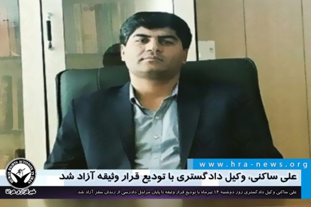 علی ساکنی وکیل دادگستری روز دوشنبه ۱۶ تیرماه با تودیع قرار وثیقه تا پایان مراحل دادرسی از زندان سقز آزاد شد. آقای ساکنی روز یکشنبه ۸ تیر توسط نیروهای امنیتی در شهر سقز بازداشت و به بازداشتگاه اداره اطلاعات سنندج منتقل شد. او نهایتا روز چهارشنبه ۱۱ تیر به زندان سقز منتقل شد. علی ساکنی وکیل مدافع هوشمند علی پور زندانی سیاسی محکوم به اعدام است.
