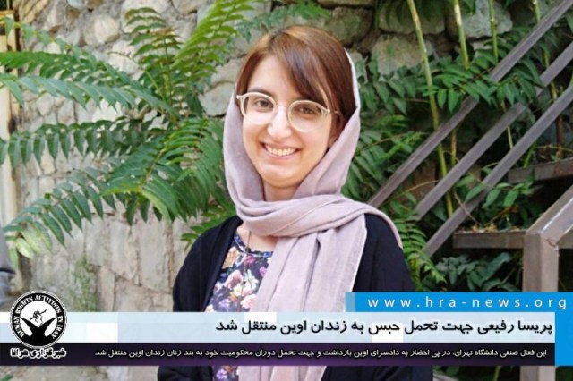 ارگان خبری مجموعه فعالان حقوق بشر در ایران، پریسا رفیعی فعال صنفی دانشگاه تهران جهت تحمل حبس به بند زنان زندان اوین منتقل شد.