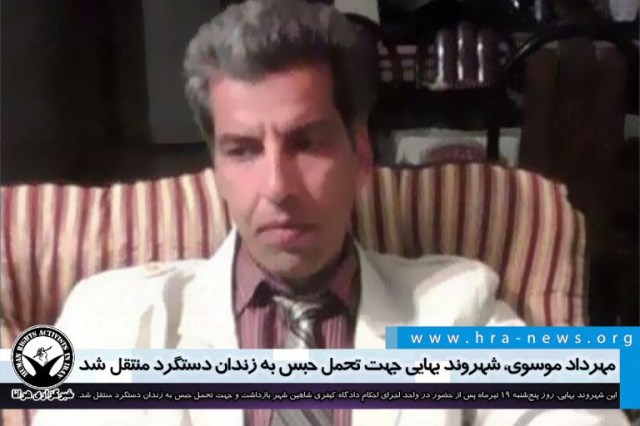 ارگان خبری مجموعه فعالان حقوق بشر در ایران، روز پنجشنبه ۱۹ تیرماه ۱۳۹۹ مهرداد موسوی، شهروند بهایی، پس از حضور در واحد اجرای احکام دادگاه کیفری شاهین شهر بازداشت و جهت تحمل حبس به زندان دستگرد منتقل شد.