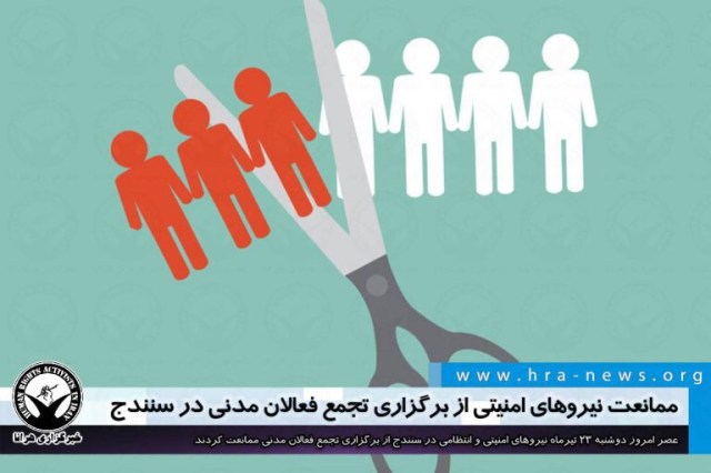 ارگان خبری مجموعه فعالان حقوق بشر در ایران، عصر امروز دوشنبه ۲۳ تیرماه ۱۳۹۹، نیروهای امنیتی و انتظامی در سنندج از برگزاری تجمع فعالان مدنی ممانعت کردند.