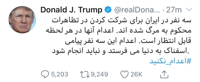 ترامپ در صفحه توییتر خود نوشت: «سه نفر در ایران برای شرکت کردن در تظاهرات محکوم به مرگ شدهاند. اعدام آنها در هر لحظه قابل انتظار است. اعدام این سه نفر پیامی اسفناک به دنیا میفرستد و نباید انجام شود. اعدام نکنید.»