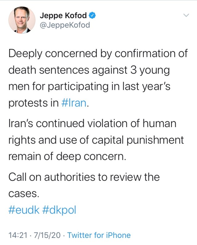 از سوی دیگر یپ کوفود، وزیر امور خارجه دانمارک، نیز در توییتی اعلام کرد که عمیقا از تایید حکم اعدام سه معترض آبان نگران است. او در ادامه صدور احکام اعدام در ایران و نقض پیوسته حقوق بشر در این کشور را محکوم کرد و خواستار بررسی این پروندهها شد.