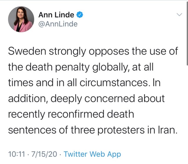آن لینده، وزیر خارجه سوئد، نیز از اقدام قوه قضاییه جمهوری اسلامی در صدور حکم اعدام برای سه نفر از معترضان آبان ماه، ابراز نگرانی کرد و گفت: «دولت سوئد به شدت با استفاده از مجازات اعدام تحت هر شرایطی مخالف است.»