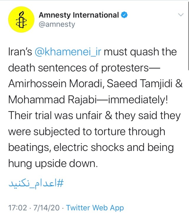 سازمان عفو بینالملل نیز در صفحه توییتر خود همراه با هشتگ «اعدام نکنید»، نوشت: «علی خامنهای، باید حکم اعدام سه معترض– امیرحسین مرادی، سعید تمجیدی و محمد رجبی– را سریعا لغو کند. دادگاه آنها منصفانه نبود، آنها گفتهاند که با کتک خوردن، شوک الکتریکی و سروته آویزان شدن شکنجه شدهاند.»