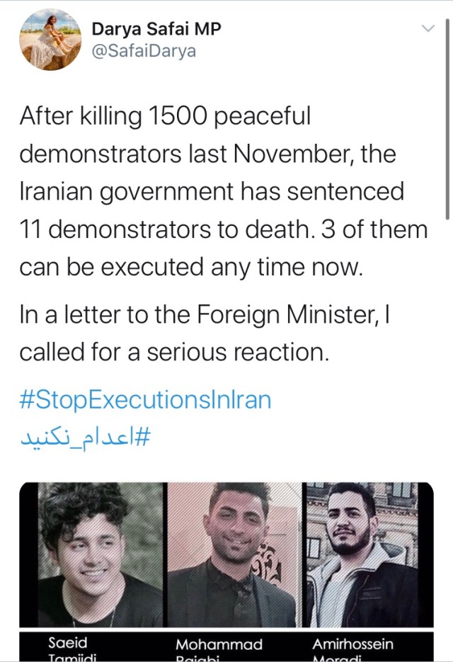 دریا صفایی، نماینده ایرانیتبار پارلمان بلژیک نیز با اشاره به اینکه حکومت ایران پس از کشتن هزار و ۵۰۰ نفر از معترضان مسالمتجو در جریان اعتراضات آبان ماه، ۱۱ نفر از معترضان را به اعدام محکوم کرده است، گفت که سه نفر از معترضان هر لحظه ممکن است اعدام شود. او گفت که در نامهای به وزیر خارجه بلژیک خواستار واکنش جدی نسبت به این احکام اعدام شده است.