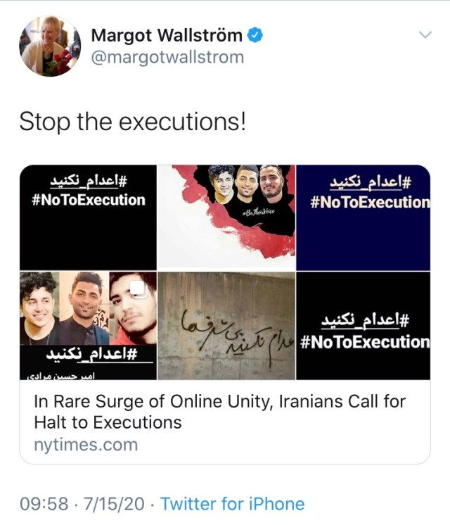 مارگوت والستروم، وزیر خارجه پیشین سوئد نیز ضمن بازنشر گزارشی از نیویورکتایمز، درباره کشتار معترضان در آبان و احکام اعدام برای شماری از معترضان، خواهان توقف اعدام در ایران شد.