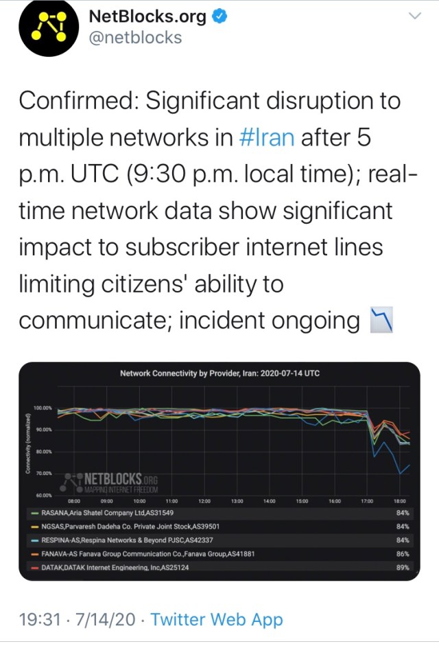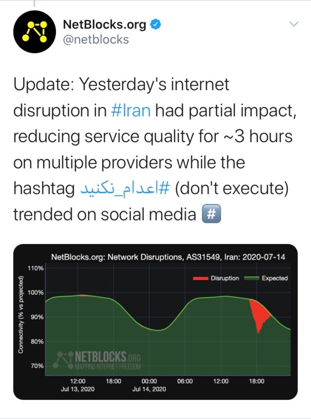 نتبلاکز که شامگاه سهشنبه از کاهش سرعت اینترنت در ایران خبر داده بود، روز چهارشنبه اعلام کرد که اختلال در اینترنت و کاهش سرعت از سوی چند سرویس دهنده اینترنت در ایران دستکم سه ساعت طول کشیده و همزمان با ترند شده هشتگ «اعدام نکنید» بوده است.