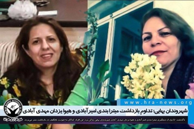 ارگان خبری مجموعه فعالان حقوق بشر در ایران، امروز یکشنبه ۲۹ تیرماه ۱۳۹۹، با گذشت ۵۰ روز از دستگیری میترا بندی امیرآبادی و هیوا یزدان مهدی آبادی شهروندان بهایی ساکن یزد، این افراد کماکان به صورت بلاتکلیف در بازداشت بسر میبرند.