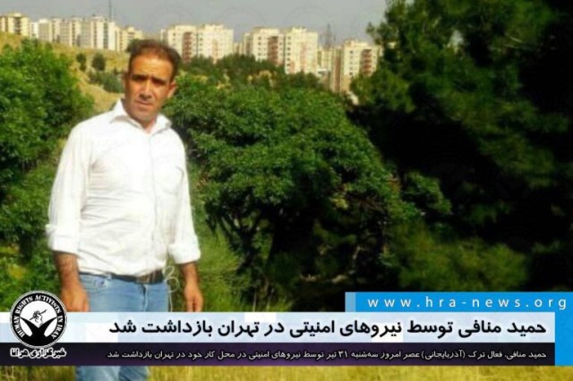 ارگان خبری مجموعه فعالان حقوق بشر در ایران، امروز سهشنبه ۳۱ تیرماه ۱۳۹۹، حمید منافی، فعال ترک (آذربایجانی) توسط نیروهای امنیتی در محل کار خود در تهران بازداشت شد.