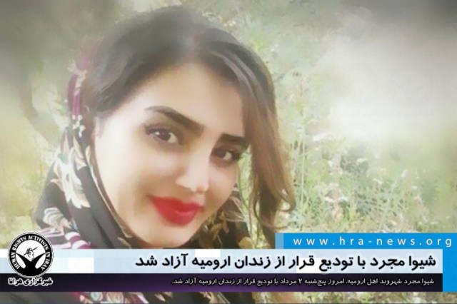 شیوا مجرد شهروند اهل ارومیه، امروز پنجشنبه ۲ مرداد با تودیع قرار کفالت از زندان ارومیه آزاد شد. خانم مجرد روز پنجشنبه ۲۶ تیرماه توسط نیروهای امنیتی مقابل منزل پدری خود در ارومیه بازداشت و نهایتا به زندان این شهر منتقل شده بود. روز پنجشنبه ۲۶ تیرماه تجمعی اعتراضی در پی فراخوان قبلی و در واکنش به تحولات منطقه در مقابل ساختمان کنسولگری جمهوری آذربایجان در تبریز و همچنین تجمعاتی مشابه در تهران و ارومیه صورت گرفت. در پی برگزاری این تجمعات شماری از شهروندان بازداشت و تعدادی در پی احضار به نهادهای امنیتی بازداشت شدند. از میان بازداشت شدگان مقصود فضلی چیمن زمین، رحیم ساسانیان، حکیمه احمدی، سعدالله ساسانیان، یاسمین ظفری و حمید جباری کماکان در بازداشت بسر میبرند.