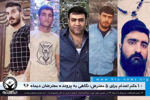 ارگان خبری مجموعه فعالان حقوق بشر در ایران، ۱۳ تن از بازداشت شدگان اعتراضات سراسری دیماه ۹۶ بر اساس پرونده های کلاسه ۹۸۰۹۹۸۳۶۳۵۵۰۱۰۰۳ و ۹۸۰۹۹۸۳۶۳۵۶۰۰۱۱۷ در بهمن ۹۸ توسط شعبه دوم دادگاه انقلاب اصفهان محاکمه شدند که بر اساس رای صادره به شماره ۹۸۰۹۹۷۰۳۶۷۳۰۰۹۶۷ پنج تن از آنان مجموعا به ده بار اعدام و حبس و باقی نیز به حبس و شلاق محکوم شدند.