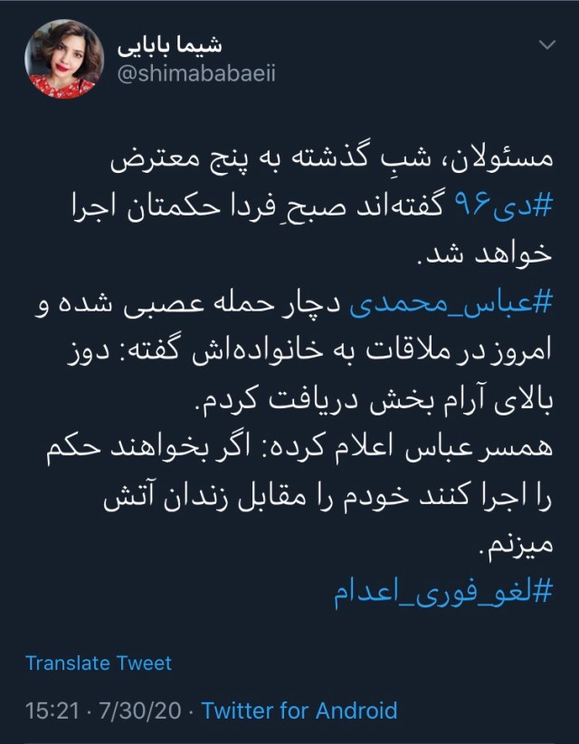 او در توییت دیگری نوشته مسئولان، شب گذشته به این معترضان گفتهاند صبح جمعه حکمشان اجرا خواهد شد.