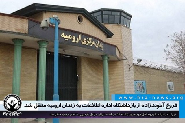 فروغ آخوندزاده، شهروند اهل ارومیه در تاریخ ۲ تیر امسال توسط نیروهای امنیتی بازداشت و به بازداشتگاه اداره اطلاعات ارومیه منتقل شد. او امروز یکشنبه ۱۲ مردادماه با پایان مراحل بازجویی از بازداشتگاه این نهاد امنیتی به زندان ارومیه منتقل شد.