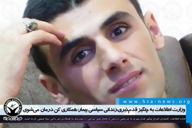به گزارش خبرگزاری هرانا، ارگان خبری مجموعه فعالان حقوق بشر در ایران، اداره اطلاعات کامیاران اعزام چنگیز قدم خیری، زندانی سیاسی تبعیدی در زندان مسجدسلیمان به مرخصی درمانی جهت انجام عمل جراحی را مشروط به همکاری وی با این نهاد امنیتی کرده است.