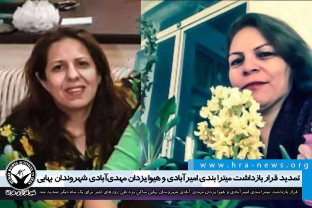 ارگان خبری مجموعه فعالان حقوق بشر در ایران، قرار بازداشت میترا بندی امیرآبادی و هیوا یزدان مهدی آبادی شهروندان بهایی ساکن یزد طی روزهای اخیر برای یک ماه دیگر تمدید شد.