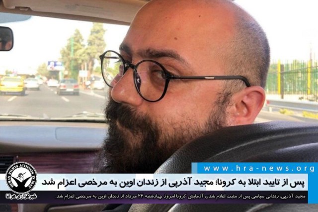 مجید آذرپی، زندانی سیاسی پس از مثبت اعلام شدن آزمایش کرونا امروز چهارشنبه ۲۲ مرداد از زندان اوین به مرخصی اعزام شد. آقای آذرپی روز یکشنبه ۱۹ مرداد به همراه ۱۱ زندانی دیگر پس از مثبت اعلام شدن آزمایش کرونا به بهداری این زندان منتقل شد.