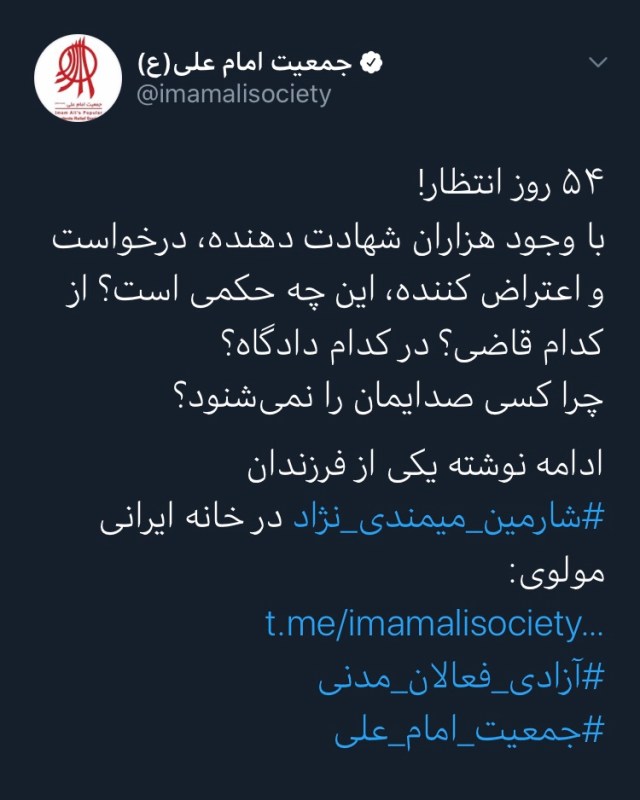 وکیل «جمعیت امام علی» خبر داد که زهرا رحیمی خامنه، مدیرعامل این جمعیت و همسر شارمین میمندینژاد، دو روز پیش احضار شده و شنبه باید در دادسرا حاضر شود.