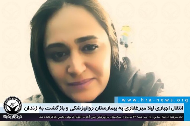 ارگان خبری مجموعه فعالان حقوق بشر در ایران، روز چهارشنبه ۲۲ مرداد ۱۳۹۹، لیلا (خدیجه) میرغفاری، فعال مدنی زندانی از بیمارستان روانپزشکی امین آباد (رازی) به زندان قرچک ورامین بازگردانده شد.