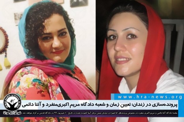 ارگان خبری مجموعه فعالان حقوق بشر در ایران، جلسه دادگاه رسیدگی به اتهامات آتنا دائمی، کنشگر مدنی و مریم اکبری منفرد زندانی سیاسی محبوس در زندان اوین در خصوص پرونده ای که اخیرا در دوران حبس برای آنها گشوده شده در تاریخ ۱۰ شهریورماه در دادگاه قدس برگزار خواهد شد.