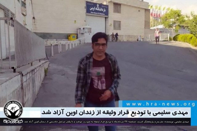 ارگان خبری مجموعه فعالان حقوق بشر در ایران، مهدی سلیمی، نویسنده، مترجم و پژوهشگر ساکن تهران امروز دوشنبه ۲۷ مردادماه با تودیع قرار وثیقه ۵۰۰ میلیون تومانی به صورت موقت و تا پایان مراحل دادرسی از زندان اوین آزاد شد.