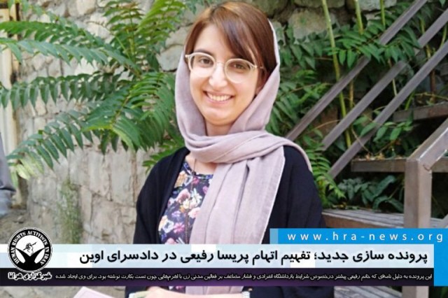 ارگان خبری مجموعه فعالان حقوق بشر در ایران، امروز چهارشنبه ۲۹ مرداد ۱۳۹۹، پریسا رفیعی، فعال صنفی دانشگاه تهران محبوس در زندان اوین جهت تفهیم اتهام از بابت پرونده جدیدی که اخیرا برای وی گشوده شده، در دادسرای اوین حاضر شد.