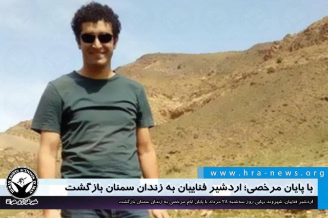 ارگان خبری مجموعه فعالان حقوق بشر در ایران، روز سهشنبه ۲۸ مردادماه ۱۳۹۹، اردشیر فناییان، شهروند بهایی با پایان ایام مرخصی به زندان سمنان بازگشت.