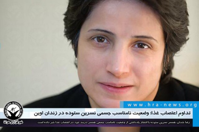 رضا خندان، همسر نسرین ستوده با انتشار یادداشتی در خصوص وضعیت همسر دربند خود گفته است “حدود ۶ کیلو از وزن ۵۳ کیلوییاش کم شده است. نوسان فشار و به ویژه میزان قند خون بسیار بالاست. حالت تهوع اجازه نمیدهد به اندازهی کافی آب و قند استفاده کند که این خود بسیار خطرناک است”. نسرین ستوده، وکیل دادگستری و فعال حقوق بشر محبوس در زندان اوین روز سهشنبه ۲۱ مردادماه، طی نامهای با شرح درخواست آزادی زندانیان سیاسی از اعتصاب غذای خود خبر داد.