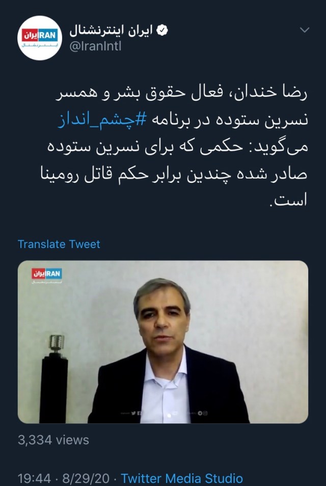 رضا خندان، فعال حقوق بشر و همسر نسرین ستوده، روز شنبه در برنامه چشمانداز تلویزیون ایراناینترنشنال گفت احکامی که برای فعالان حقوق بشر صادر میشود هیچ تناسبی با وضعیت پرونده آنها ندارد. او افزود احکام فعالان حقوق بشر صرفا به دلیل انتقاد از افراد و یا نهادهای حکومتی به دلیل پیگیری پروندههای قربانیان نقض حقوق بشر برای آنها صادر میشود و دادرسی عادلانه در مورد آنها مراعات نمیشود.